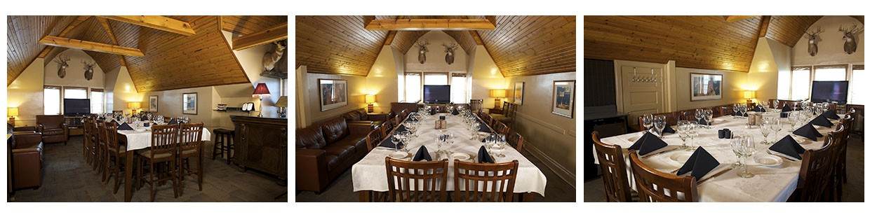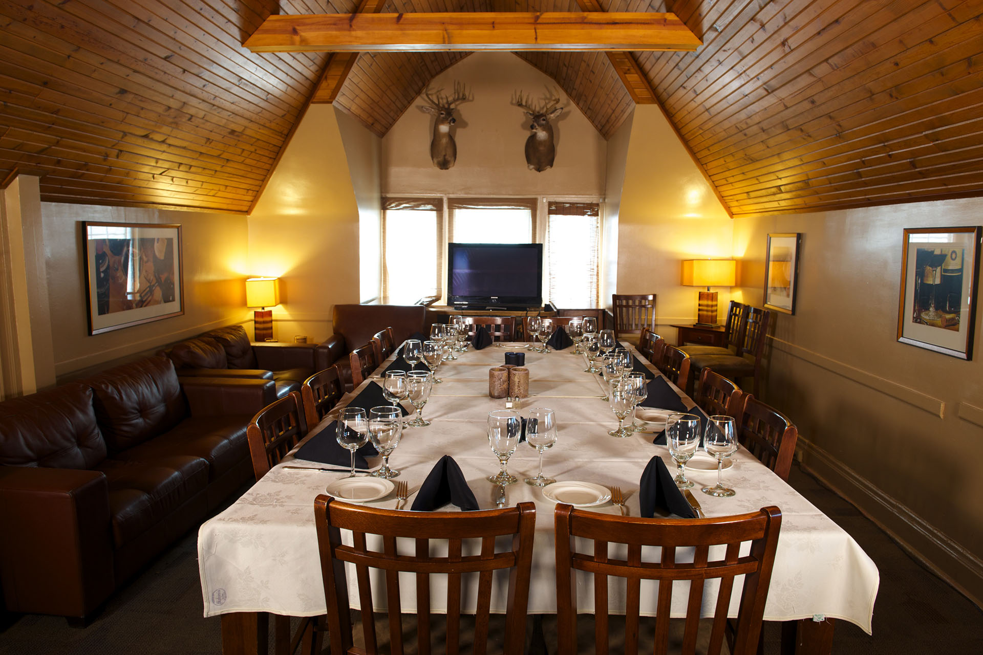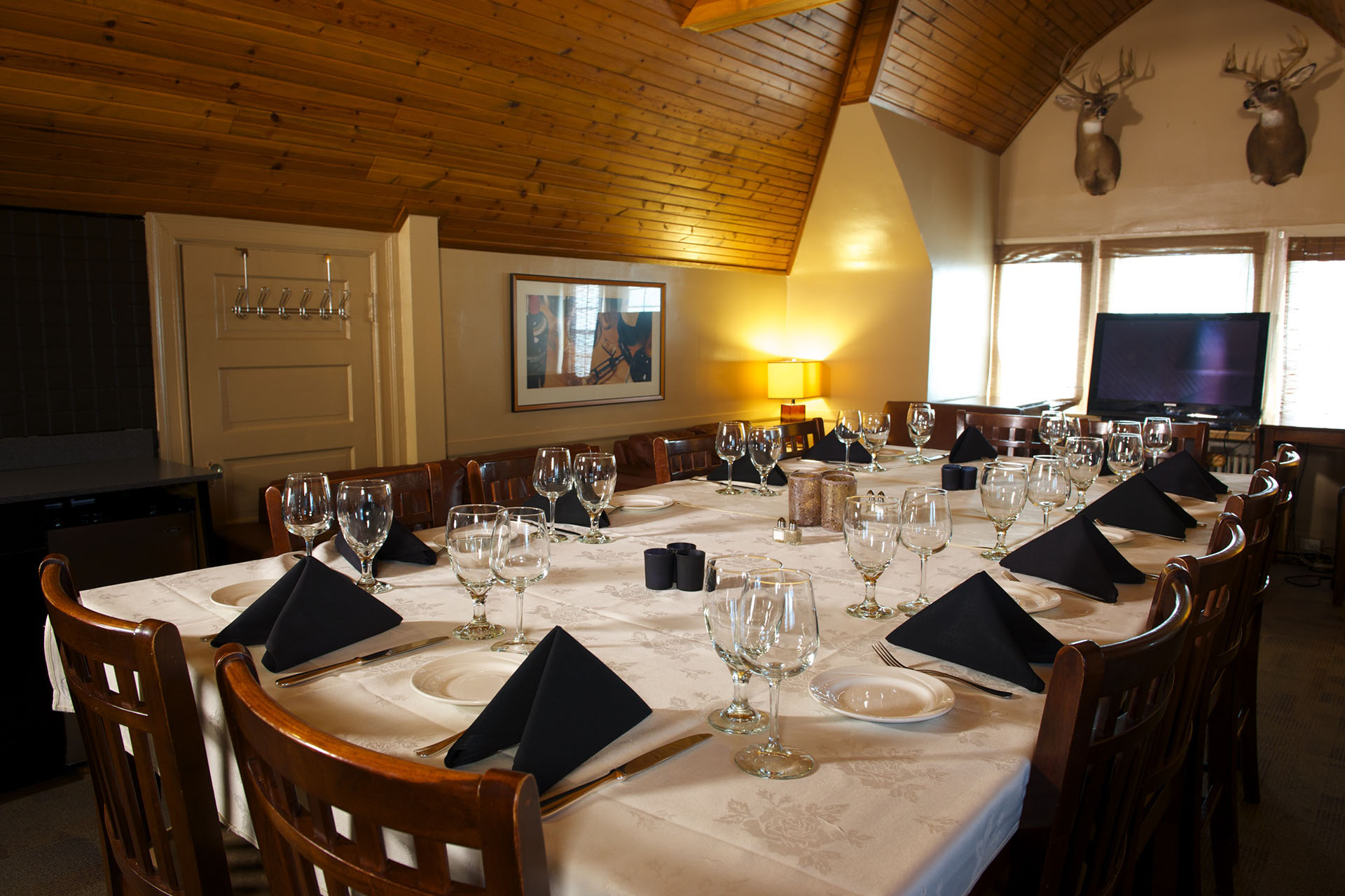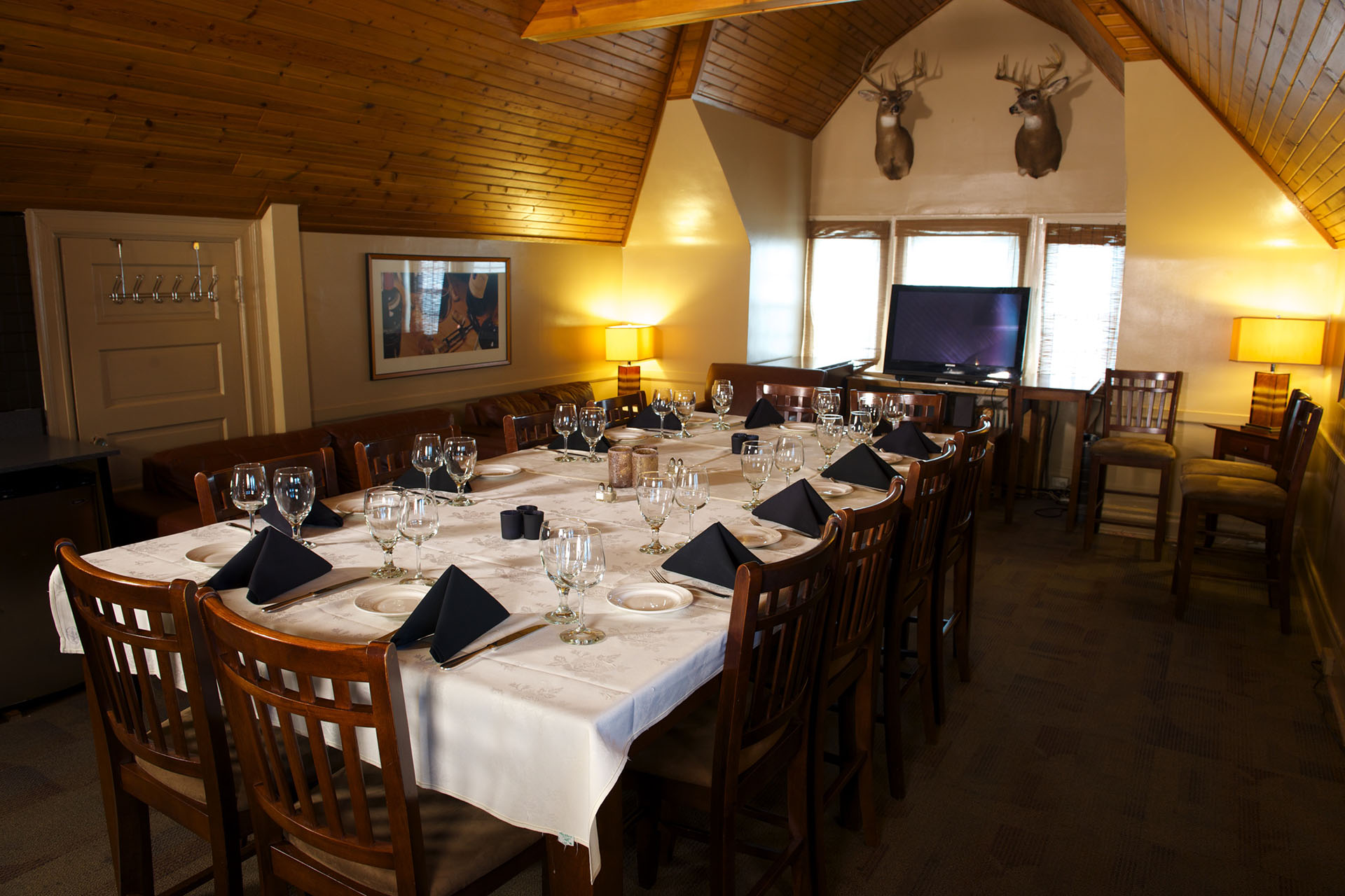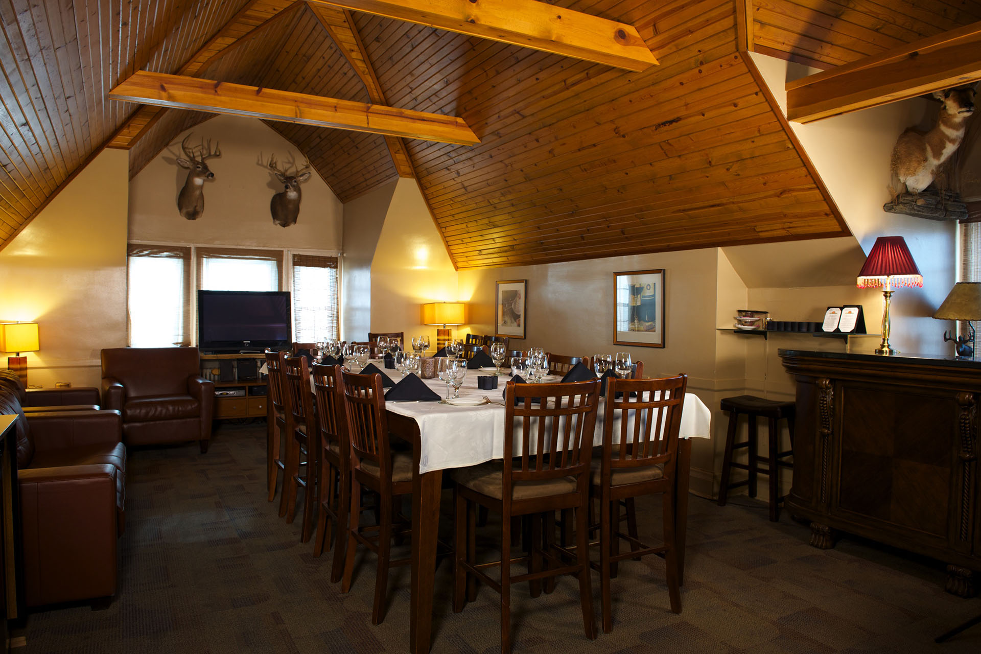 The Lodge is a private room for any type of gathering. Styled in a rustic design with the combined feeling of a loft and a mountain resort with wooden beams and a Knotty Pine cathedral ceiling. This unique room with its cozy feel has a plush leather sofa with leather chairs, and a large flat screen TV, suitable for any entertainment or presentation need. The Lodge can hold up to twenty four comfortably for any occasion and is accessible by stairs only.